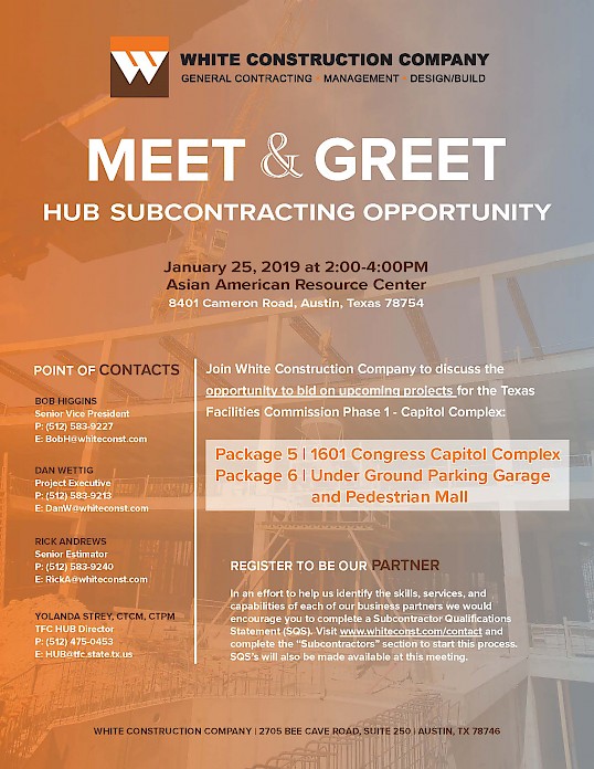 Join White Construction Company on January 25, 2019 at 2PM at the Asian American Resource Center to discuss the opportunity to bid on upcoming projects for the Texas Facilities Commission Phase 1 - Capitol Complex: