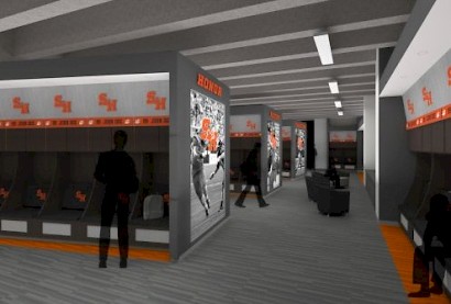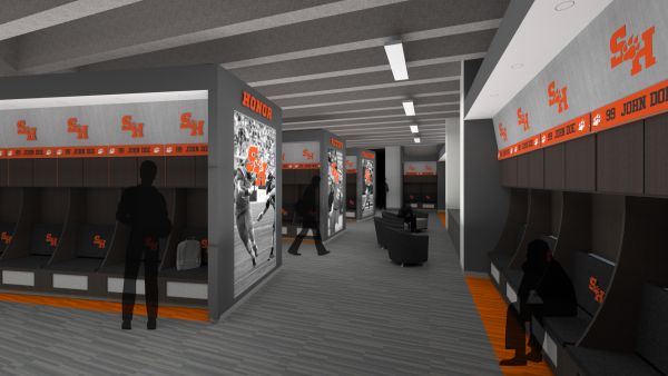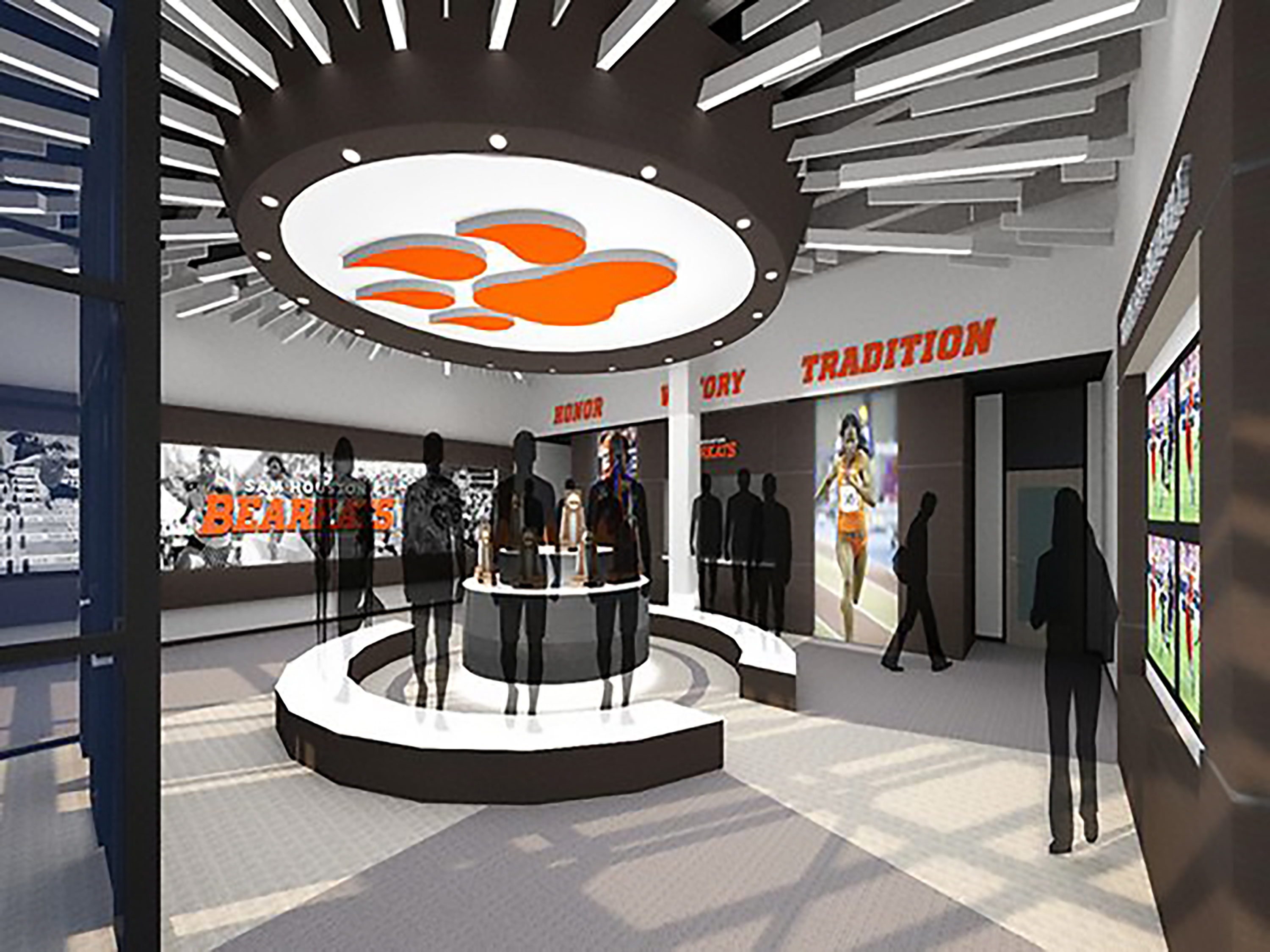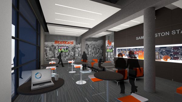 New amenities will include a locker room for visiting teams on the first floor, new hydrotherapy tanks suspended from the second floor, and SHSU football and track locker rooms. The locker rooms will provide custom lockers, player lounges, media walls, new restroom facilities, showers, and grooming stations. A new state-of-the-art sports medicine suite features two plunge pools and exam rooms for taping, treatment, and rehabilitation. The third-floor houses football and track and coaches' offices. The Bearkat Sports Welcome Center, designed for student-athlete recruitment, features a terrazzo floor and matching ceiling. An Athletic Director's Suite, also on this level, includes private offices for senior staff, an open office area for administrative staff, private conference rooms, and a central workroom.