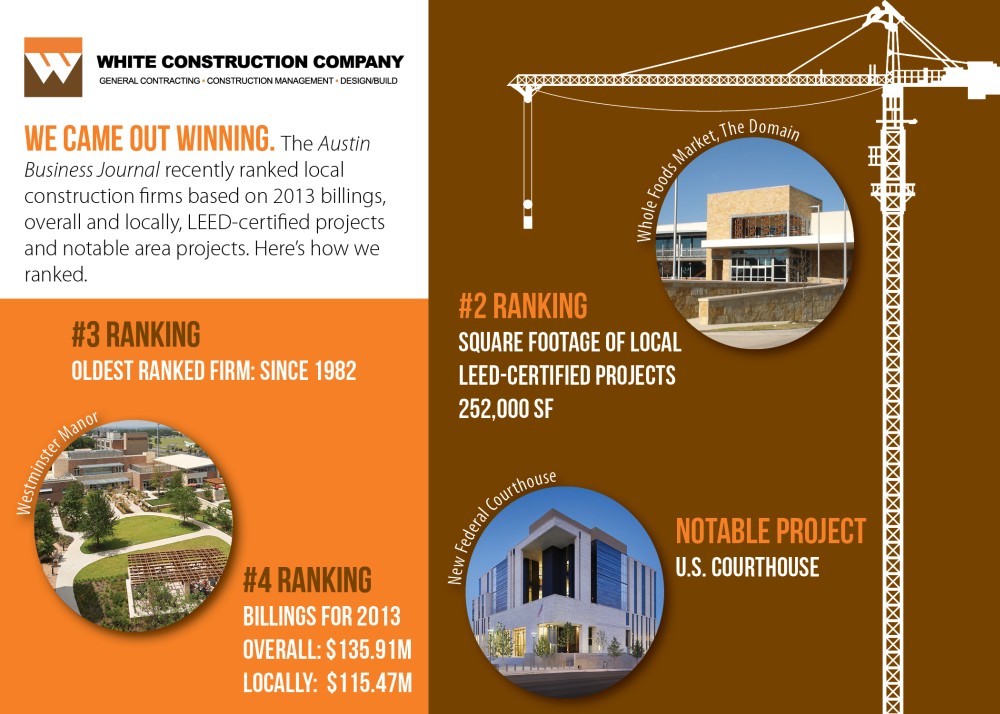 Austin Business Journal Reports High Rankings for White Construction June 9, 2014 11:00 am Back to All News