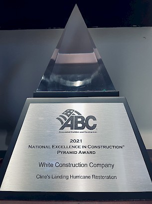 White Construction Company's (WCC) work on the Cline's Landing Condominiums Hurricane Restoration project in Port Aransas, Texas, has earned a national Excellence in Construction® (EIC) Pyramid Award, presented during the ABC Convention 2022 in San Antonio on March 16, 2022. The EIC awards are the construction industry's leading national competition honoring general and specialty contractors for world-class, safe, and innovative construction projects.