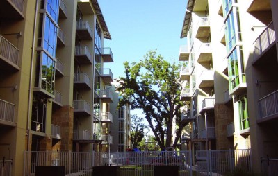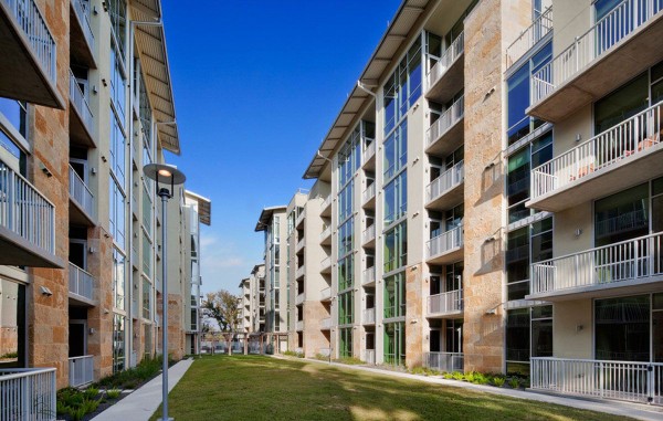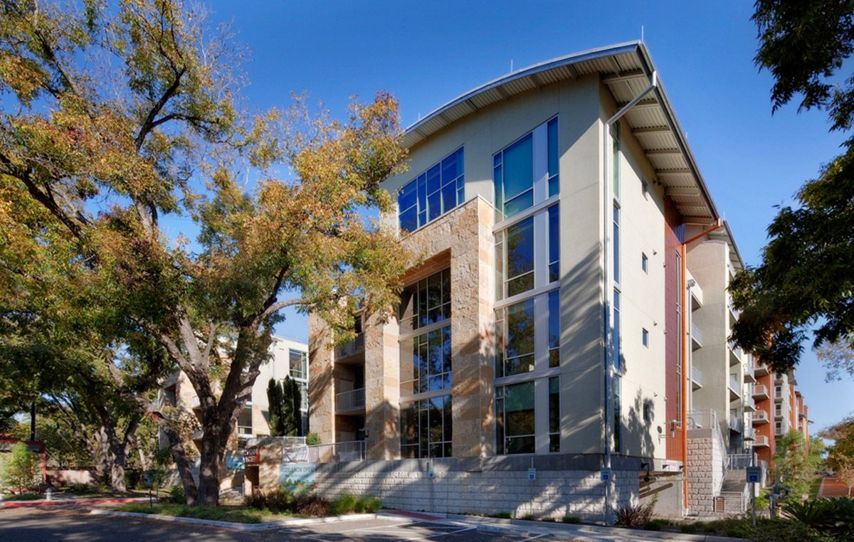 Strategically located in the heart of Austin, the project includes six separate five-story condominium buildings on top of a two-level underground parking garage. The 270 living units include one-, two- and three-bedroom configurations. The exterior façade consists of glass curtainwall, punctuated with natural stone, stucco and metal panel veneers. The roof areas are accented with western red cedar canopies and standing seam barrel roofs. A relaxing central courtyard with swimming pool, cabana and open lawns divide the property longitudinally.