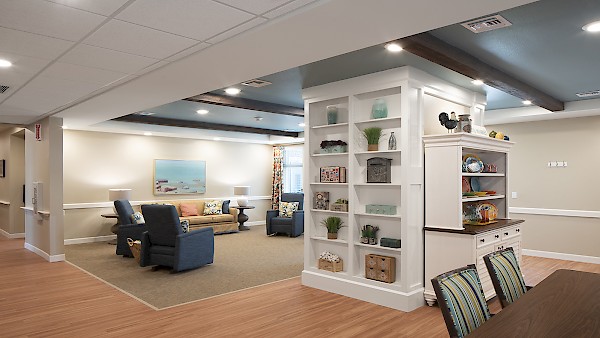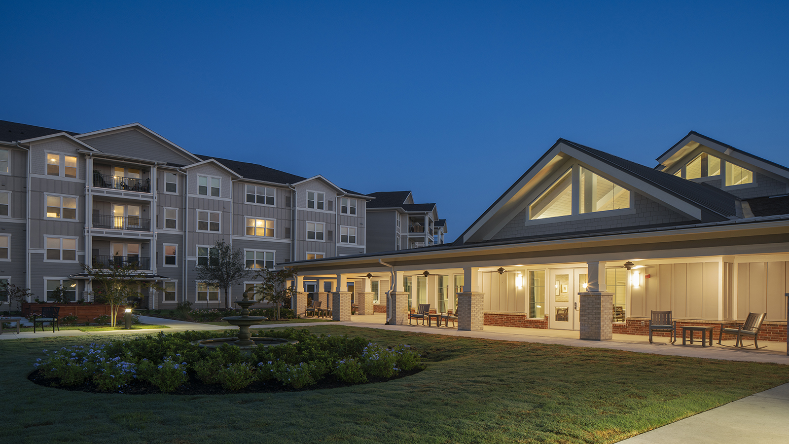 The Delaney at South Shore Harbor is a complex of five buildings totaling 204,000 sqft of space with a full suite of amenities, including courtyards with grills, counters, fountains, landscaping, ornamental fencing and a dog park. Common areas include commercial kitchen and dining areas, a bar, community areas with fireplaces, club room, fitness and exercise rooms, activities room, and administrative offices. Residential buildings have 120 independent living units, 55 assisted living units, and 32 memory care units and associated common spaces. The feature element of the complex is the Commons Building with a porte cochere entry, housing a gallery room. This grand space is distinguished with exposed wood timbers, tongue and groove wood plank ceilings and stained finish.