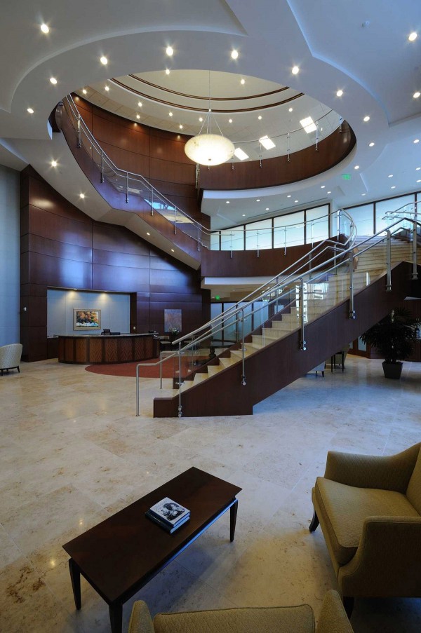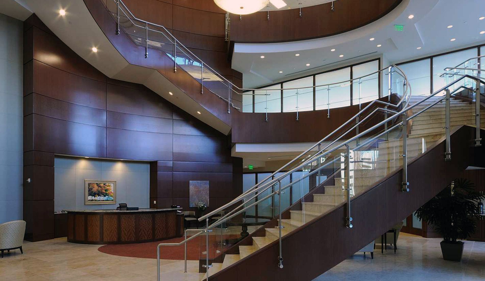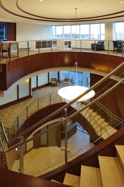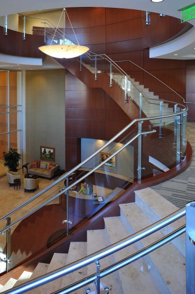 The most notable and challenging feature of this project was the elliptical-shaped monumental stairs spanning three floors. Mahogany veneer panels were applied to the sides, limestone installed over the treads and risers, and a continuous glass handrail system installed along the entire length. The result is breathtaking.