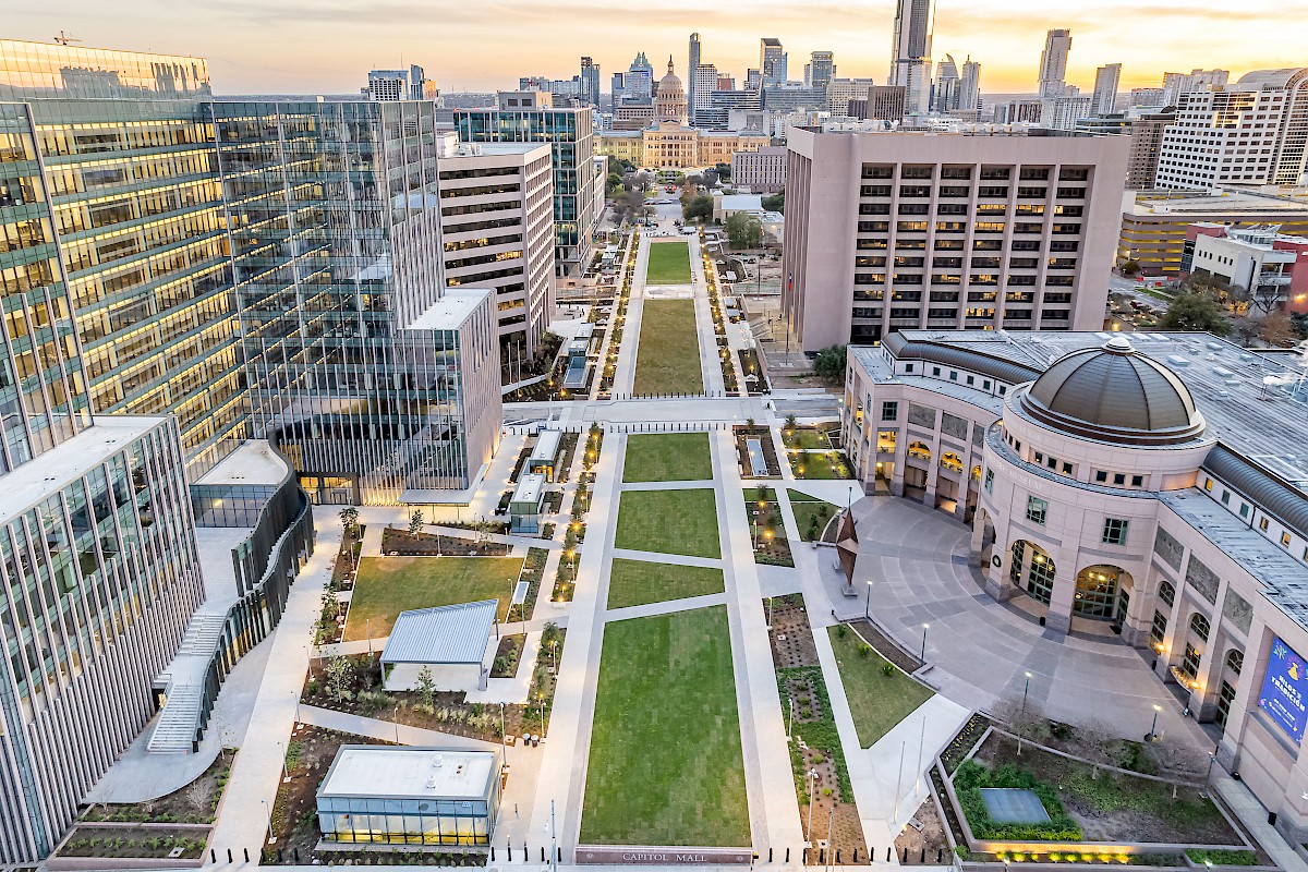 The State of Texas, through its Texas Facilities Commission, has reimagined the capital complex in downtown Austin. Its Master Plan features the state’s iconic pink granite capitol as its anchor and is characterized by grand civic spaces, shaded pedestrian-friendly streets, and connections to the surrounding community. The plan’s first phase includes two new office buildings and five levels of underground parking, which provide a base for a new pedestrian-oriented Texas mall.