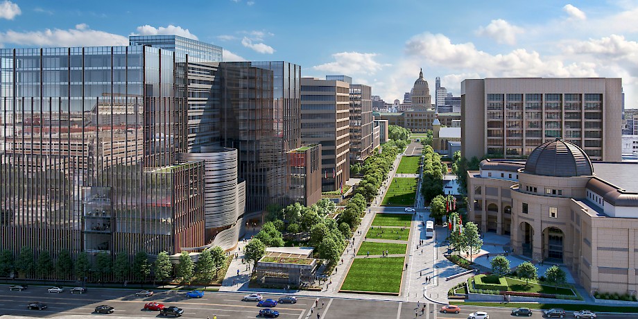 In 2016 Texas introduced a Capitol Complex Master Plan to reimagine the state’s capitol campus as a destination that would celebrate the Capitol building and centralize all state agencies — characterized by grand civic spaces, shaded pedestrian-friendly streets and connections to the surrounding community.