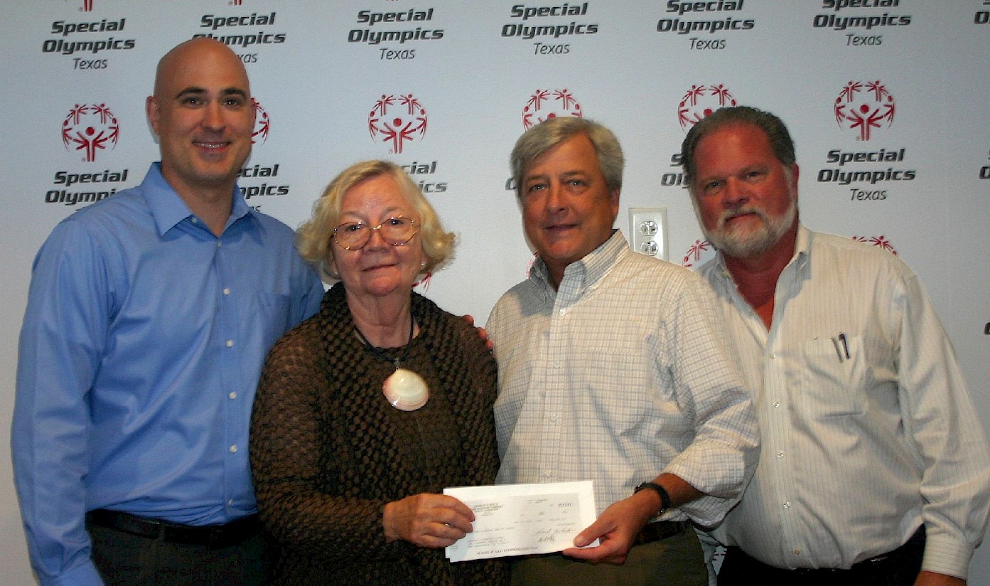 To celebrate White Construction’s completion of Special Olympics Texas’s new home, Neel White presents a gift to Margaret Larsen, SOTX President and CEO. Brad Barber and Bob Higgins join in the celebration.