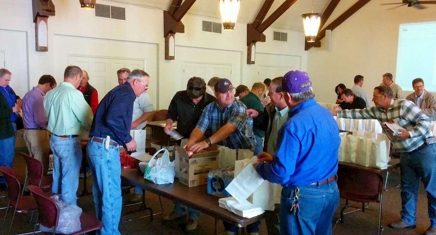 White Construction employees gathering for community service at The Episcopal Church of the Good Shepherd in Austin, preparing bags of supplies for homeless people served by the church.