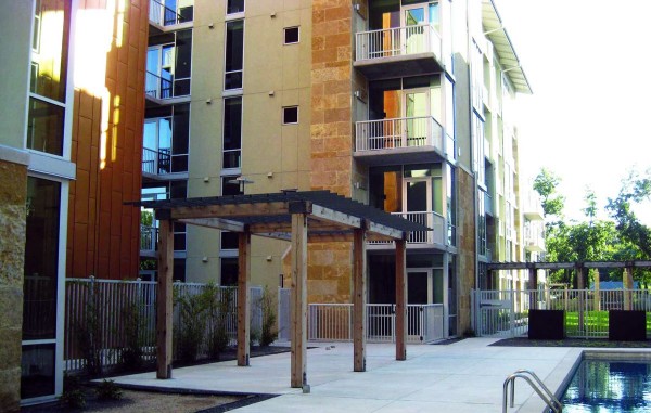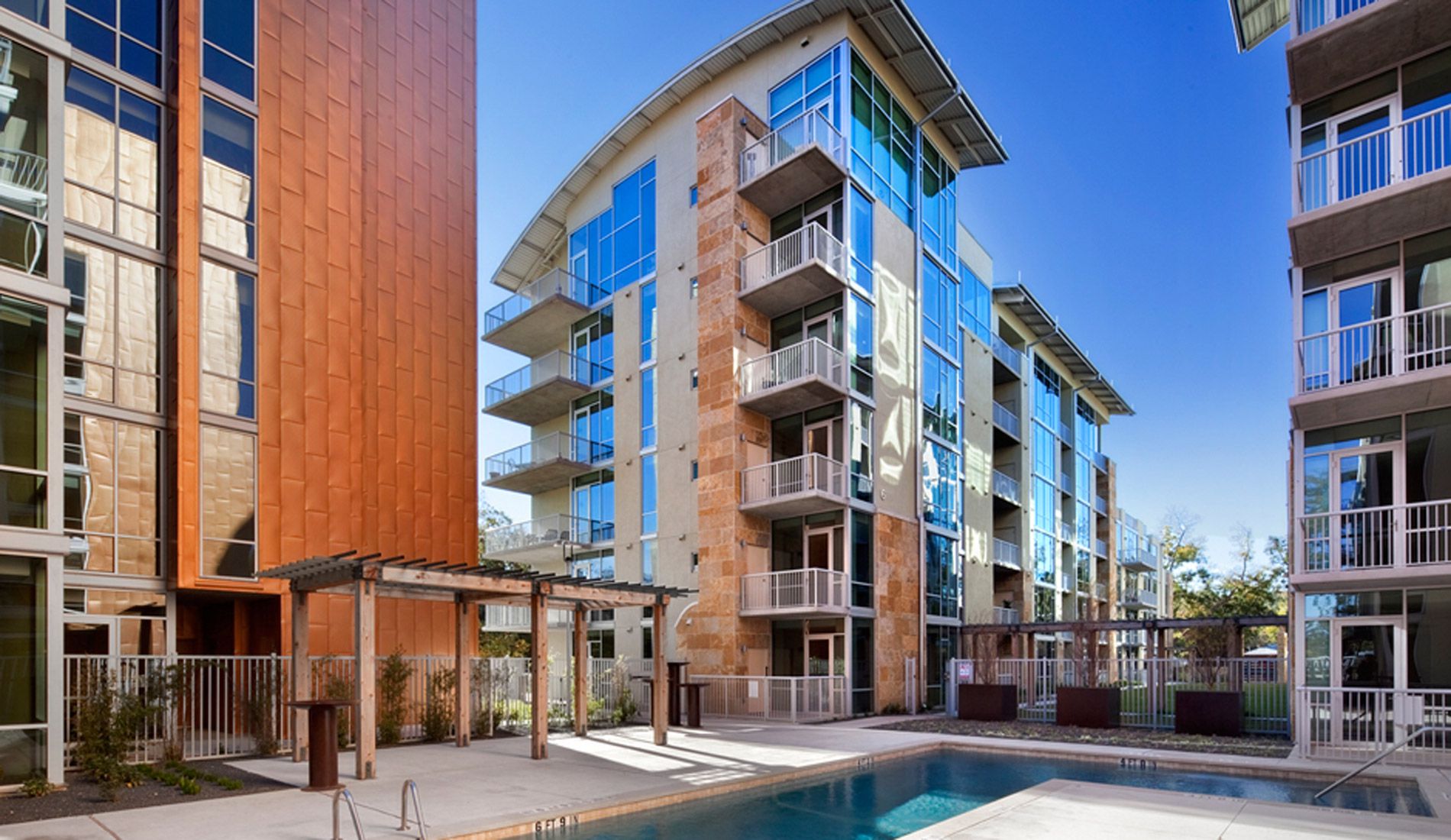 Strategically located in the heart of Austin, the project includes six separate five-story condominium buildings on top of a two-level underground parking garage. The 270 living units include one-, two- and three-bedroom configurations. The exterior façade consists of glass curtainwall, punctuated with natural stone, stucco and metal panel veneers. The roof areas are accented with western red cedar canopies and standing seam barrel roofs. A relaxing central courtyard with swimming pool, cabana and open lawns divide the property longitudinally.