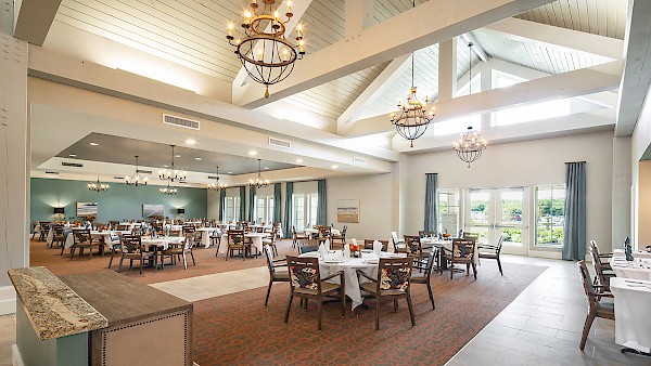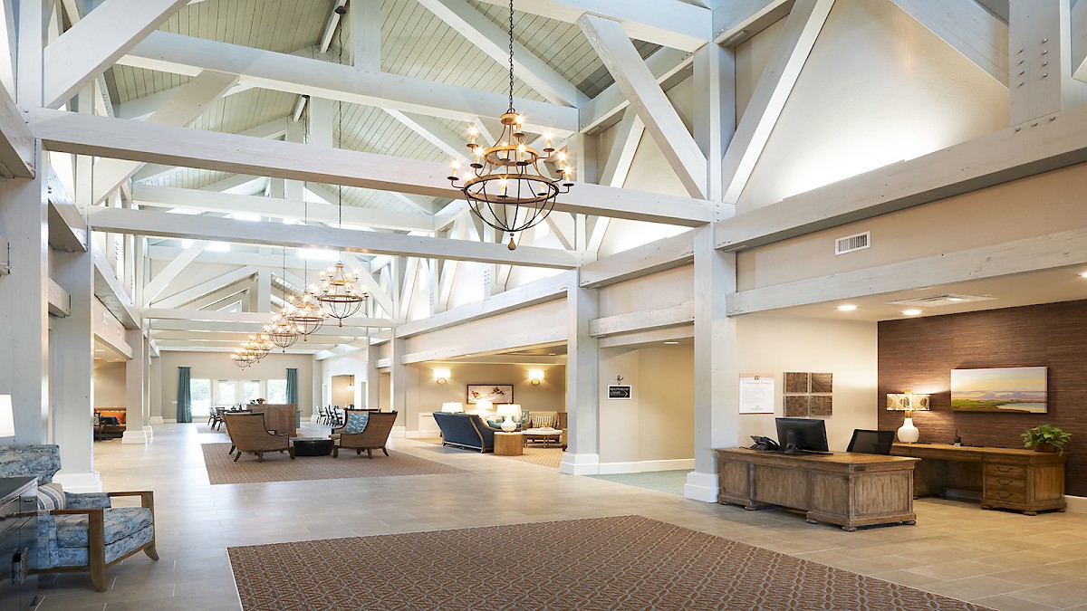 The Delaney at South Shore Harbor is a complex of five buildings totaling 204,000 sqft of space with a full suite of amenities, including courtyards with grills, counters, fountains, landscaping, ornamental fencing and a dog park. Common areas include commercial kitchen and dining areas, a bar, community areas with fireplaces, club room, fitness and exercise rooms, activities room, and administrative offices. Residential buildings have 120 independent living units, 55 assisted living units, and 32 memory care units and associated common spaces. The feature element of the complex is the Commons Building with a porte cochere entry, housing a gallery room. This grand space is distinguished with exposed wood timbers, tongue and groove wood plank ceilings and stained finish.