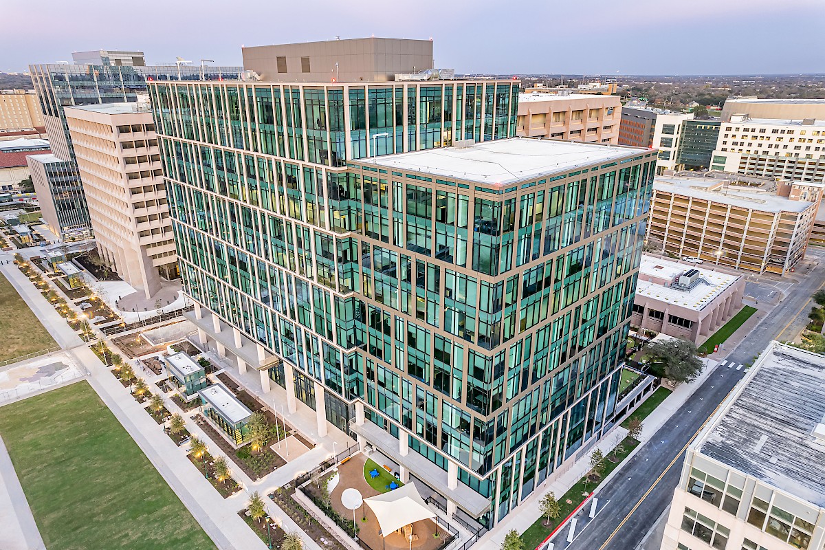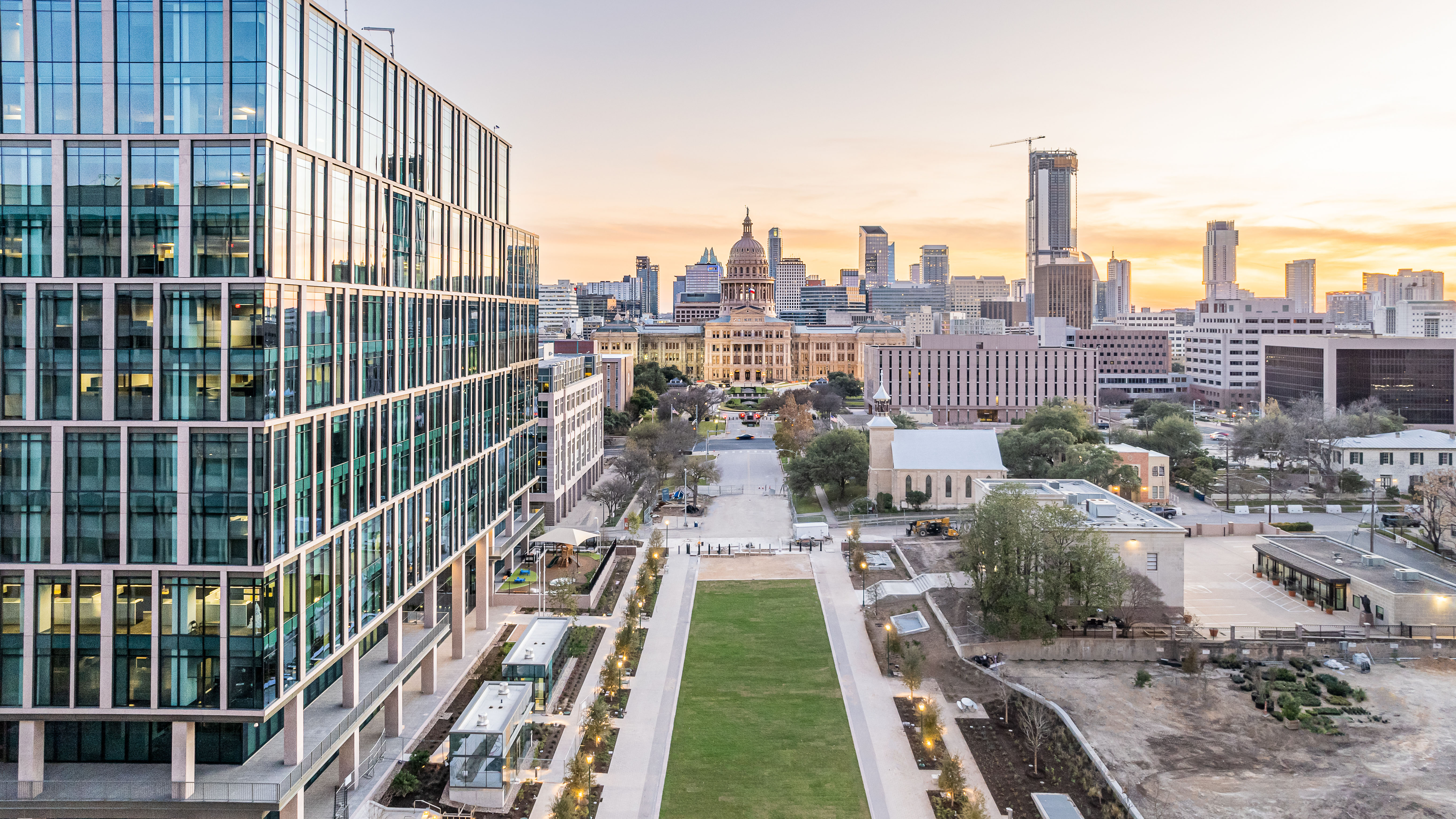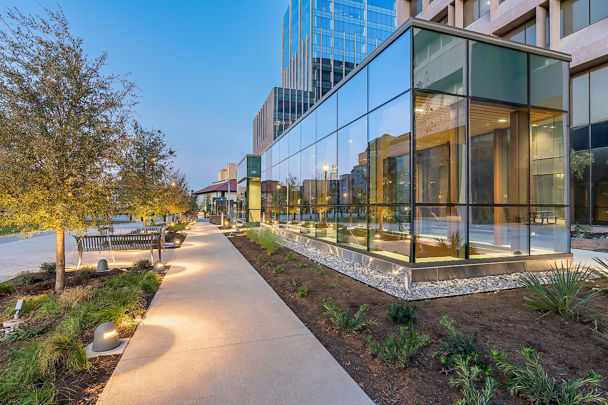 The State of Texas, through its Texas Facilities Commission, has reimagined the capital complex in downtown Austin. Its Master Plan features the state’s iconic pink granite capitol as its anchor and is characterized by grand civic spaces, shaded pedestrian-friendly streets, and connections to the surrounding community. The plan’s first phase includes two new office buildings and five levels of underground parking, which provide a base for a new pedestrian-oriented Texas mall.