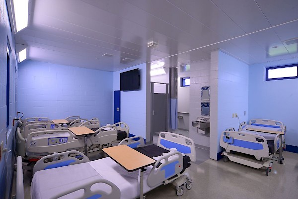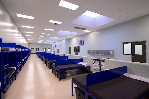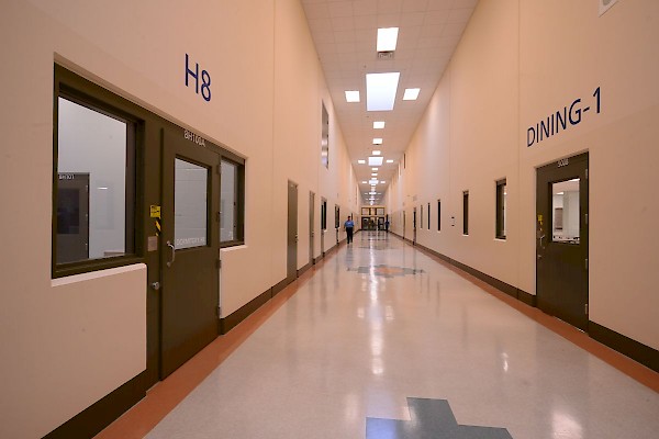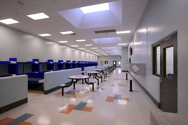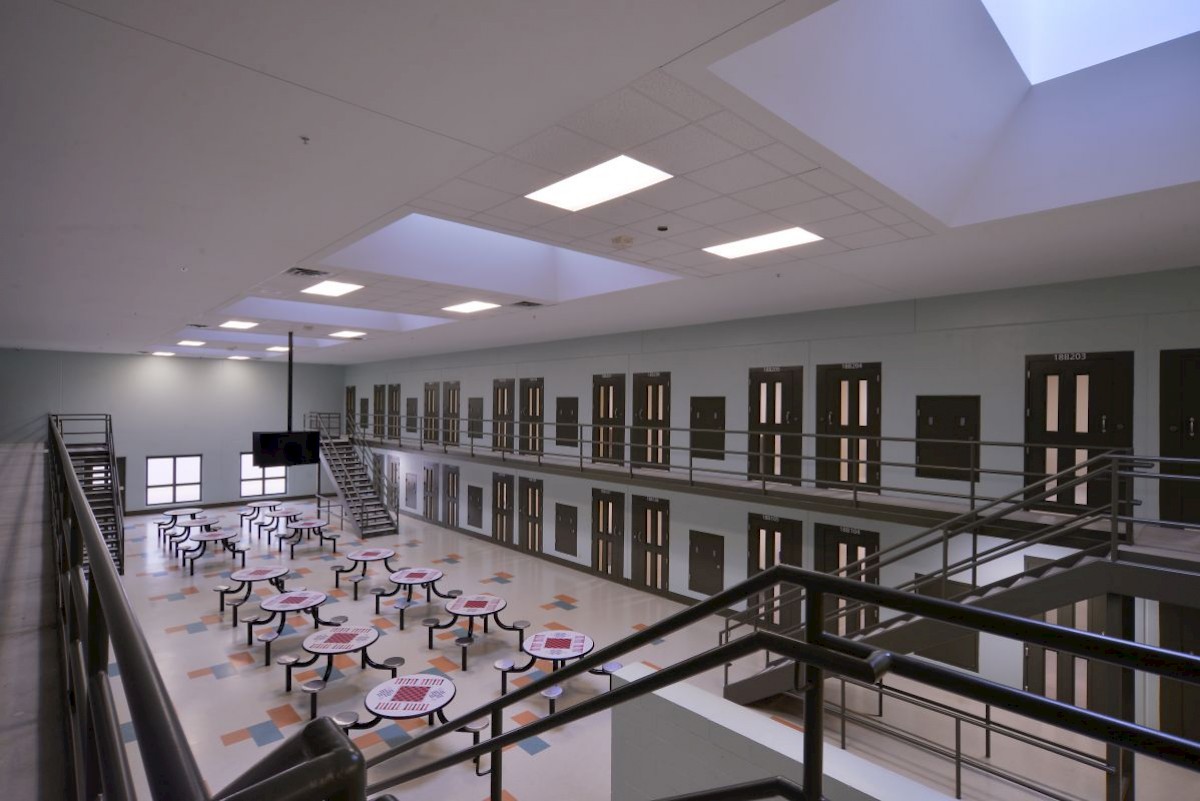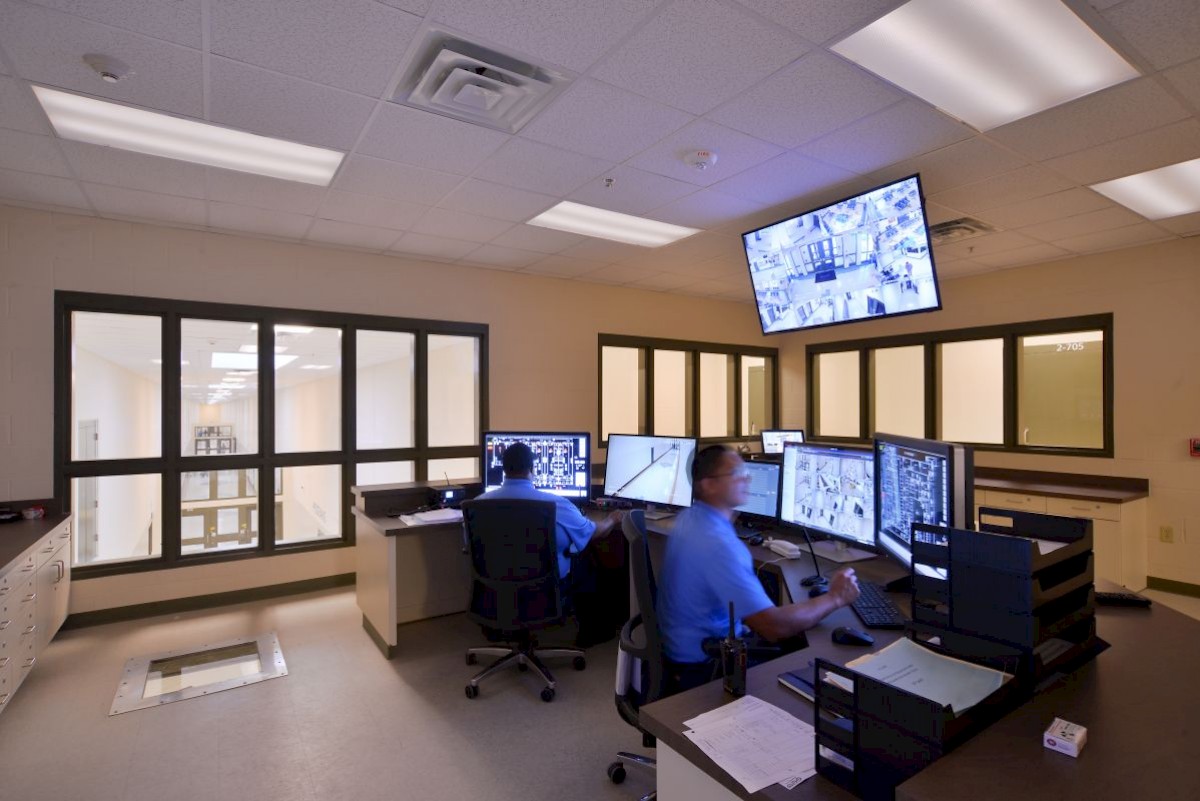 The facility includes male and female-segregated cell units, sixteen dormitory units, five elevators, dining areas, a kitchen, large walk-in coolers, freezers, dry storage rooms, medical, dental, and pharmacy areas, intake/removal processing stations, staff training rooms, command center, muster room, large office areas, and central electrical/mechanical room. In addition, multiple remote mechanical and electrical rooms are strategically located throughout the facility, including security control rooms.