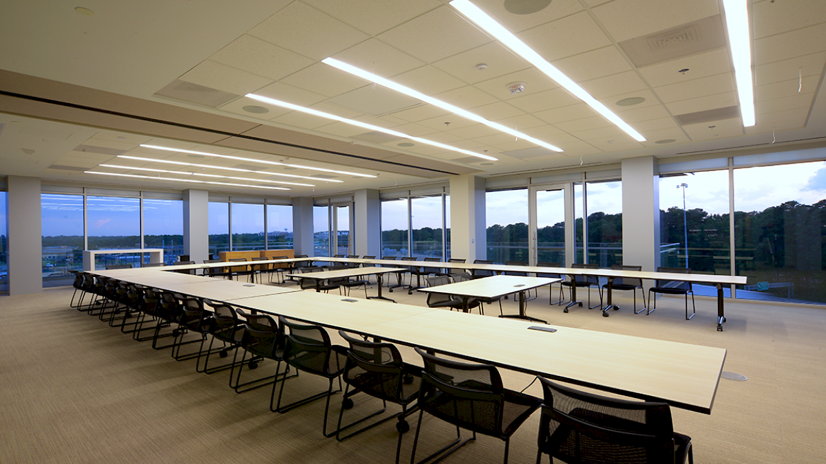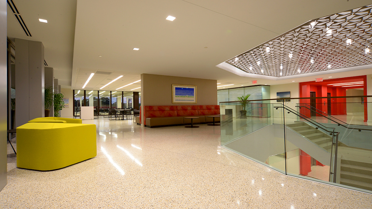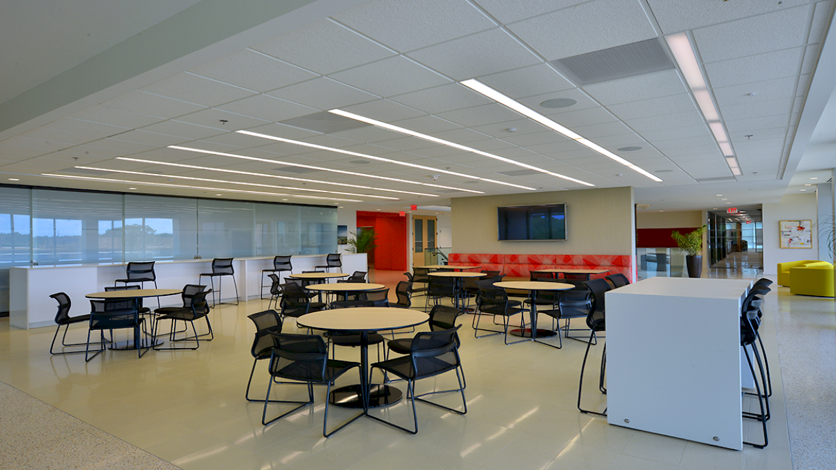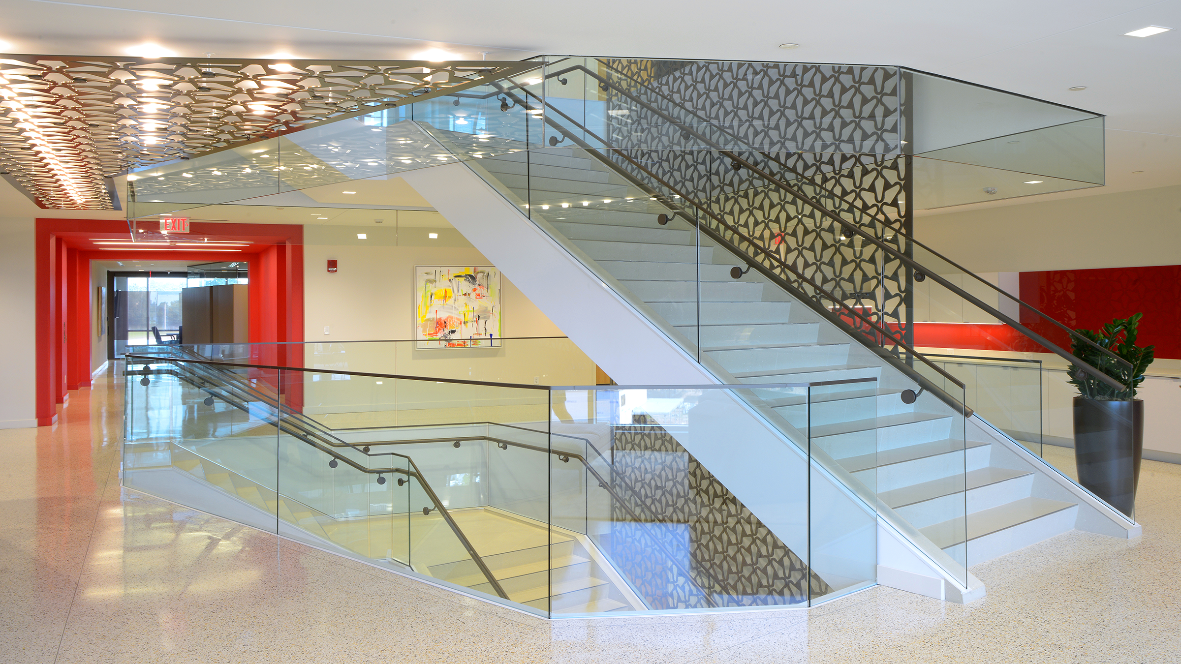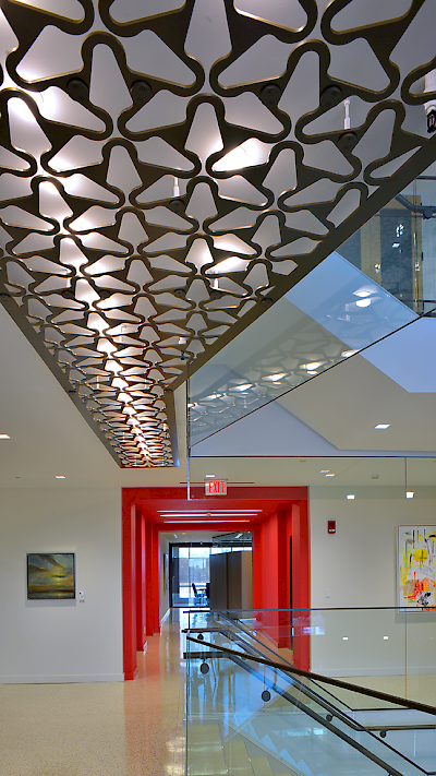 The project encompassed the third, fourth, and fifth floors of Jackson’s newest developments, “The District.” The most prominent feature is a spectacular three-story monumental staircase, fitted with custom glass handrails. It is accentuated with a custom fabricated “Magnolia Screen” spanning all three floors and punctuated with dramatic accent lighting. Attorney offices are enclosed by custom colored butt-glazed aluminum storefront systems with laminated specialty glass. A multipurpose room, equipped with a vertical folding operable glass wall and state-of-the-art audio, visual, and lighting control, features high-end catering kitchens and a café. The schedule was organized in phases to accommodate the owners’ commitment to vacate their existing space.
