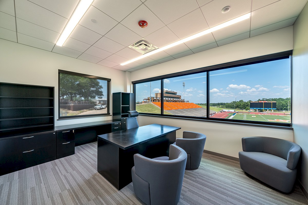 The third floor houses football and track coaches' offices. An Athletic Director's Suite, also on this level, includes private offices for senior staff, an open office area for administrative staff, private conference rooms, and a central workroom.