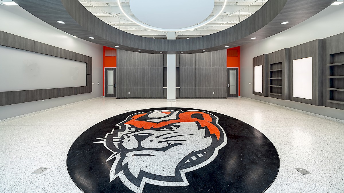 A state-of-the-art sports medicine suite features two plunge pools and exam rooms for taping, treatment, and rehabilitation. The Bearkat Sports Welcome Center, designed for student-athlete recruitment, features a terrazzo floor and matching ceiling.