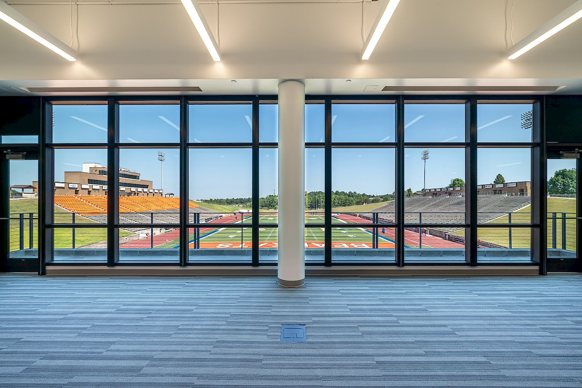 The renovation and expansion of The Sam Houston State University Mafrige Field House began by removing all existing building interiors, building systems, and select structural and exterior elements. Interior stairs were replaced, and a new elevator was installed along with new MEP systems featuring state-of-the-art technology and audio/visual systems.