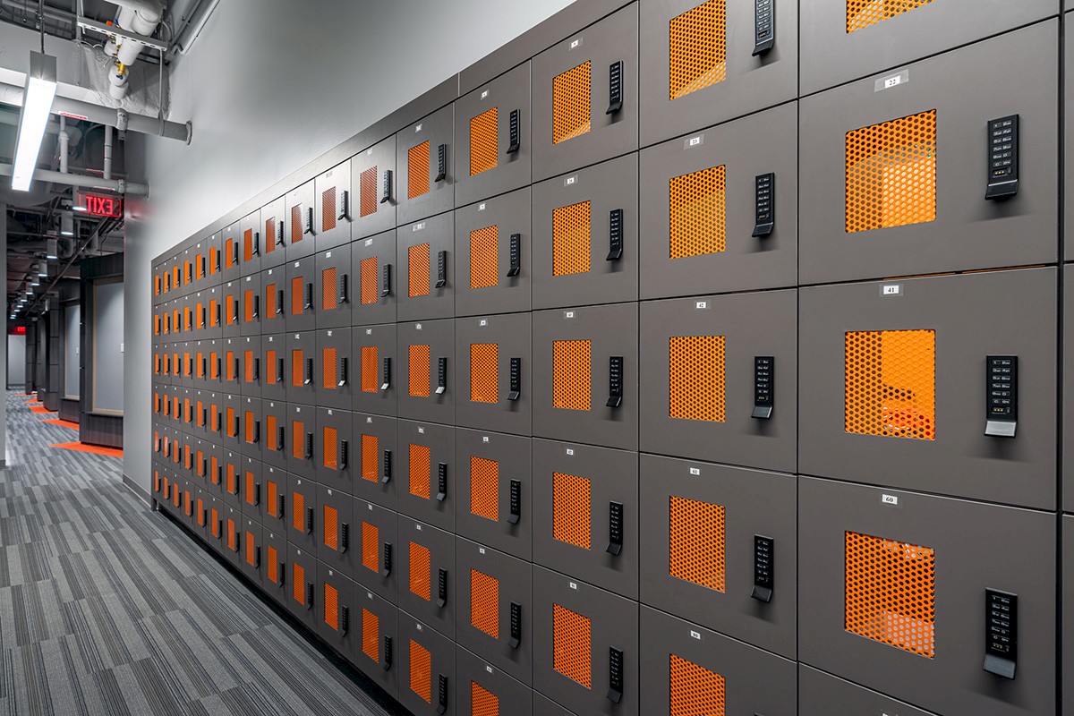 The brilliant design was conceived by PBK Sports, one of the industry's premier sports facility designers. New amenities include a locker room for visiting teams on the first floor, new hydrotherapy tanks suspended from the second floor, and SHSU football and track locker rooms. The locker rooms provide custom lockers, player lounges, media walls, new restroom facilities, showers, and grooming stations.