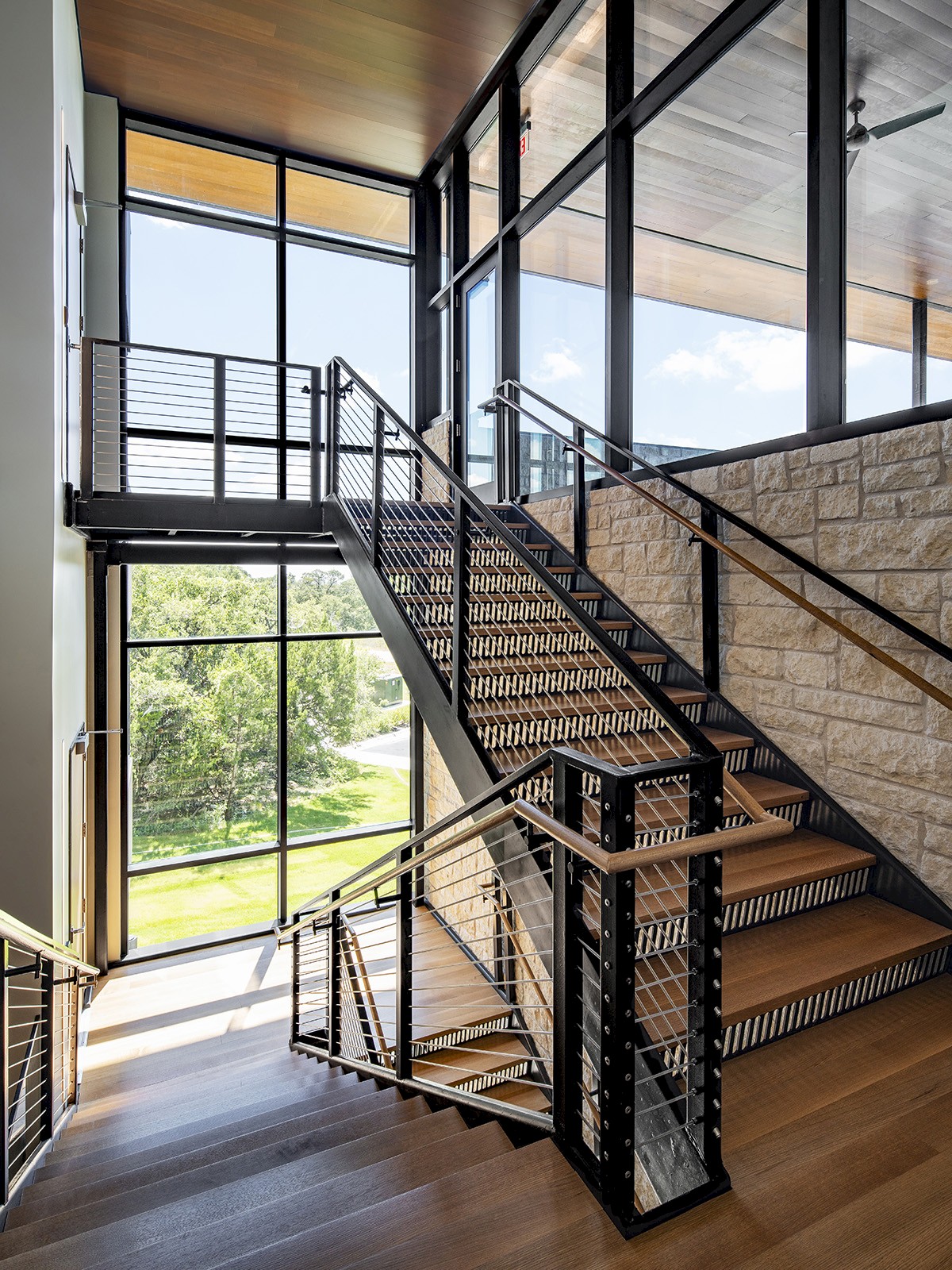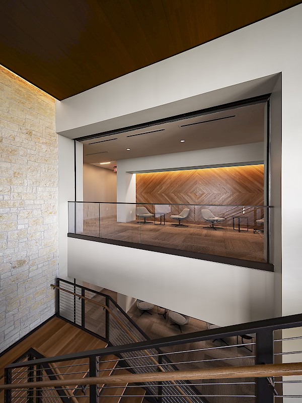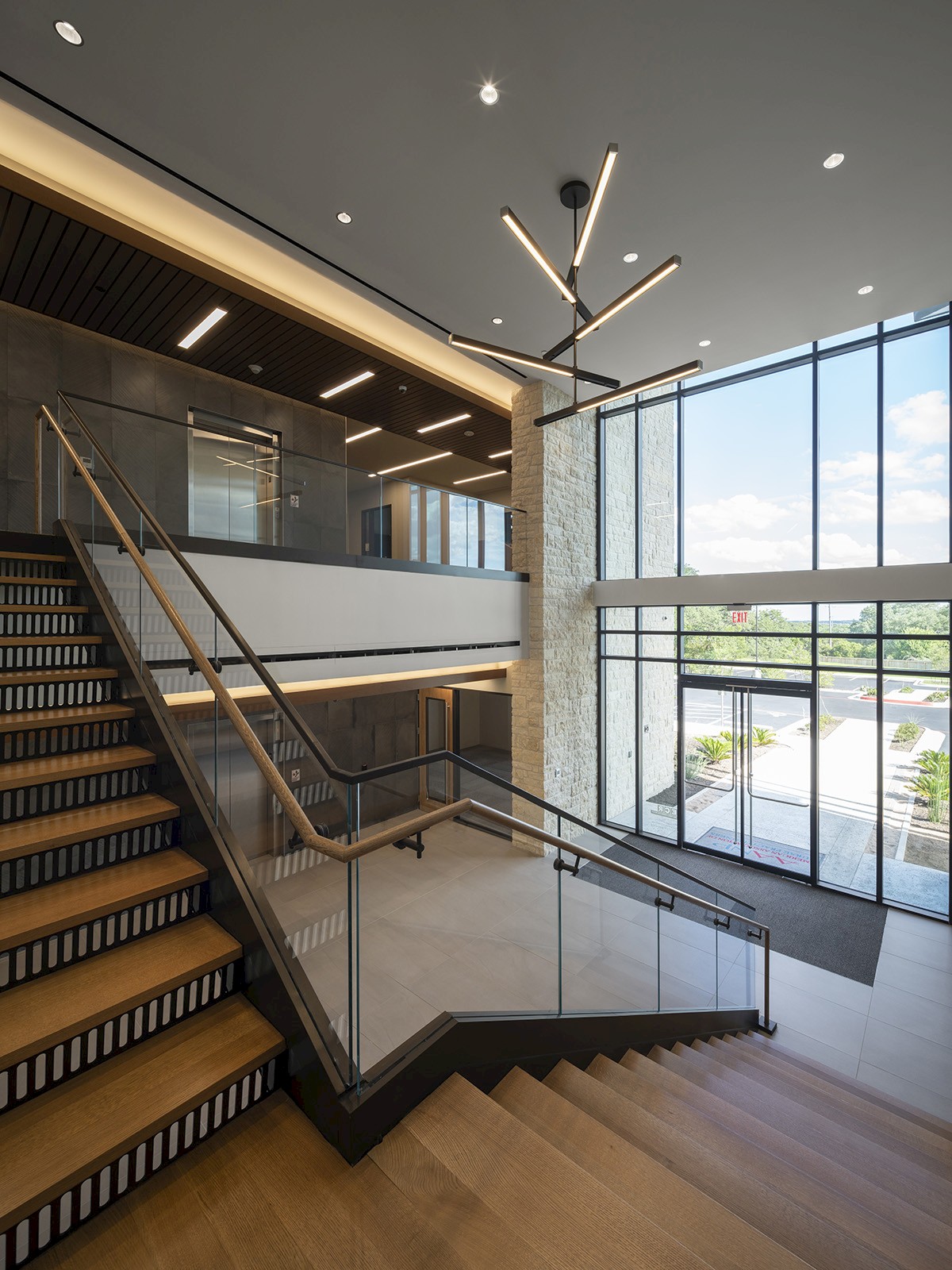 AANP new headquarters building is Class-A office space within a 3-story building on 5 acres in southwest Austin, Texas. The design is intended to bring outside in by use of floor to ceiling windows, soaring views, and incorporation of natural materials.